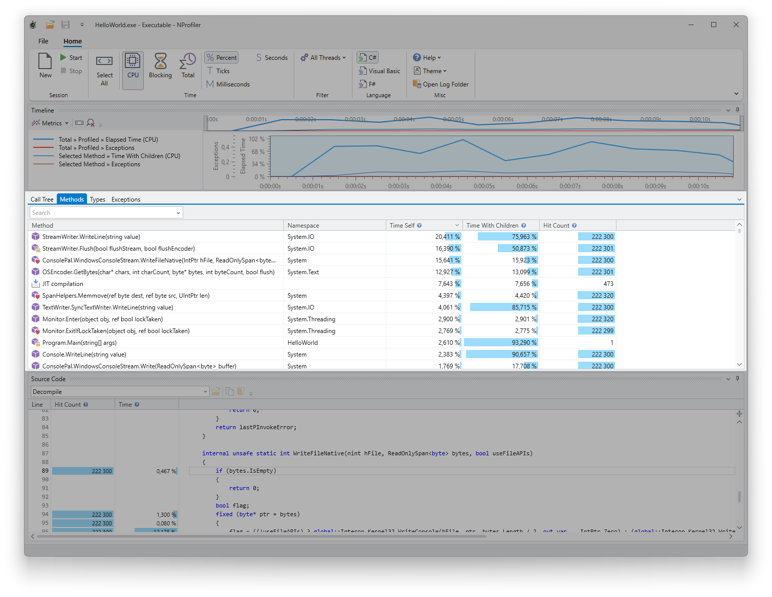 The method list displays all called methods, their execution time, and their invocation count.