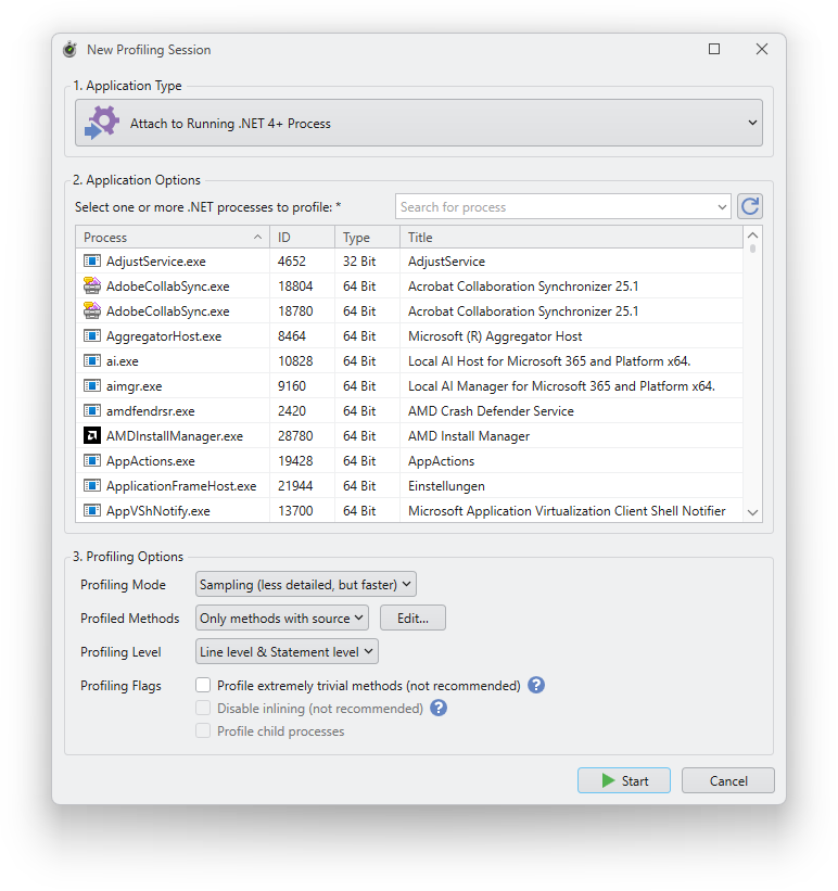 Required. Select one or more processes to which NProfiler should be attached. These must be processes that have loaded .NET runtimes. You can use the search box above the process list to search by name, title, or process ID. You can also sort the list by clicking on the column headers.