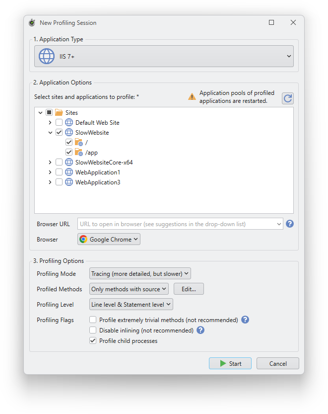 Required. Select one or more sites or applications to be profiled. Although you can select individual applications here, profiling actually takes place at the application pool level. This means that other applications in the same application pool are also profiled, even if they have not been selected.
