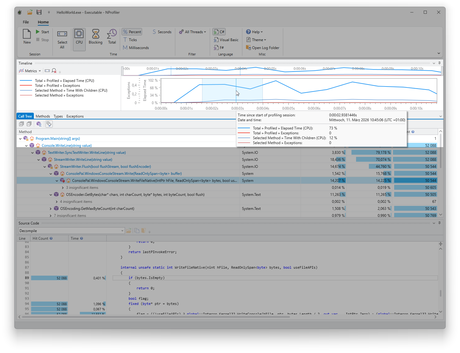 The timeline supports various metrics which can be toggled via the “Metrics” button in the toolbar. These include execution times and exception counts at both the session and method levels, covering both profiled and unprofiled code. For detailed definitions of each metric, hover over the entries within the Metrics menu to display informative tooltips.