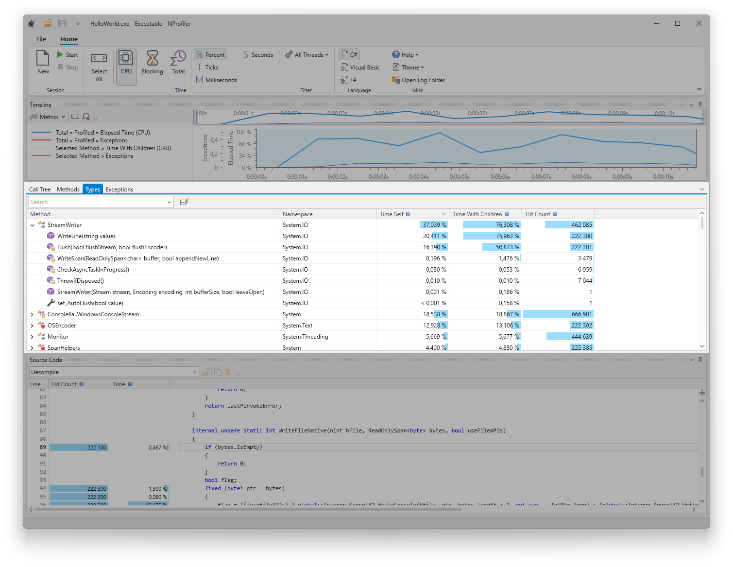 The type list displays all invoked methods grouped by their respective types. You can analyze time consumption and the number of method calls at both the method and type levels.